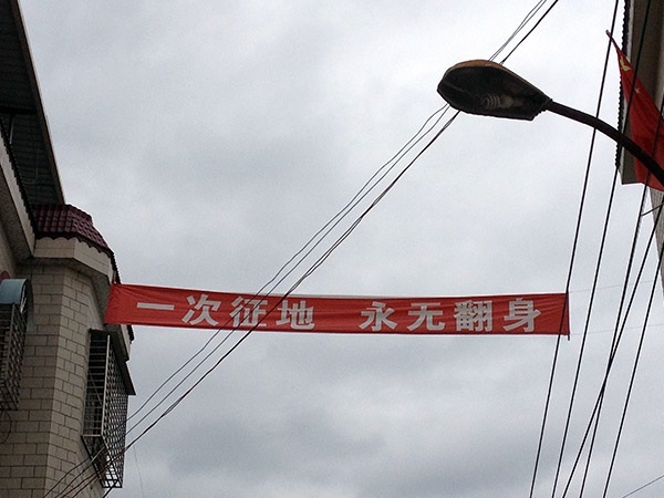 The protest banner reads, “Land is expropriated one time, but being stuck [in the peasant class] is forever. The key cultural reference in the banner is 翻身, which William Hinton left untranslated in the classic account or China’s revolution, Fanshen. Character by character the expression means “turn over / body” and referred to the revolutionary transformation of peasant life under the communists.