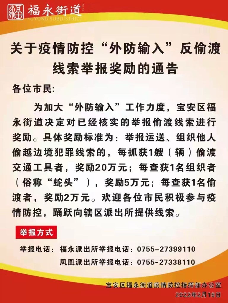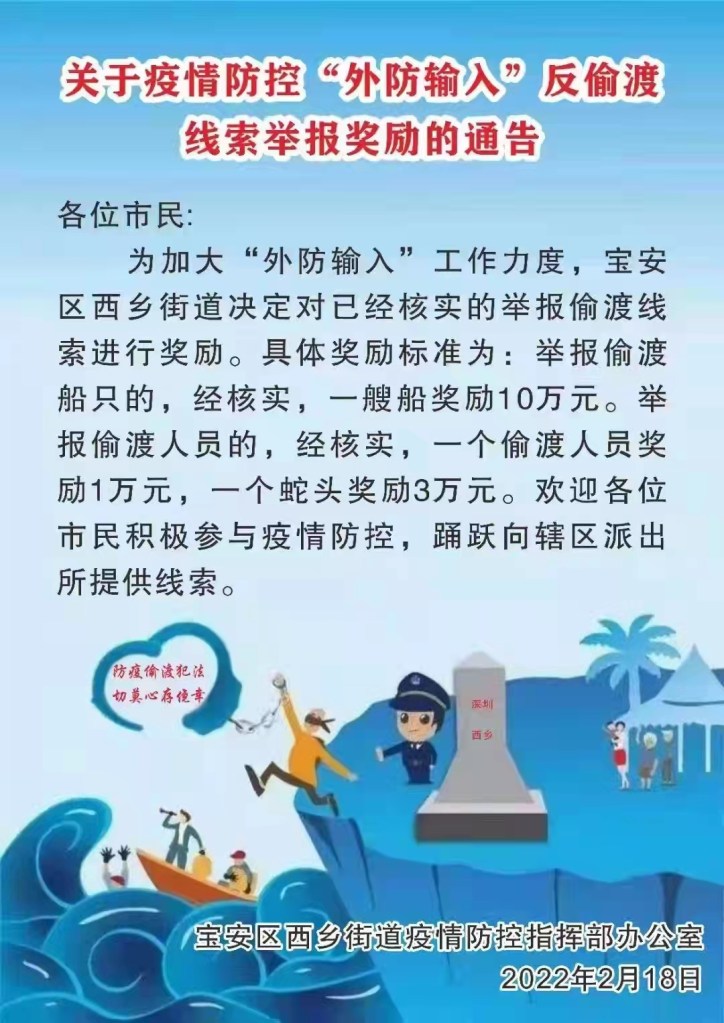UPDATE: As of midnight, Monday, February 21, 2022, Shenzhen’s ports will also be closed. When the fishing boats return they will be quarantined for 14 days. I’m also attaching two local government announcements offering rewards for turning in people illegally in the city. Of note? These two Bao’an subdistricts seem to acting independently of the district as they are offering different rewards for information leading to the capture of boats, snake heads, and illegal immigrants.