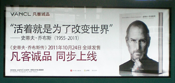 Thus described, the kind of buxiu that Jobs has achieved seems classically neoliberal and begs all sorts of questions about how and why we are busy commodifying every aspect of our lives and afterlives. Indeed, we are clearly using economic metaphors to organize how we treat the living and the dead. How else to understand a world where trust can refer to forms of human relationship that have been structured by multi-generational financial arrangements? Consequently, talking about Steve Jobs and VANCL in Shenzhen reminded me of yet another cross-cultural capitalist truth; there’s as much honor and respect attached to VANCL’s use of Steve Jobs to promote online shopping, as there is when his American compatriots link the price of Apple stock to his passing.